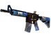 The M4A4 | The Emperor finish covers the rifle with bold blue and gold hues, showcasing the Emperor tarot motif, finely detailed across the body and magazine. The design is static and does not change with the pattern index.